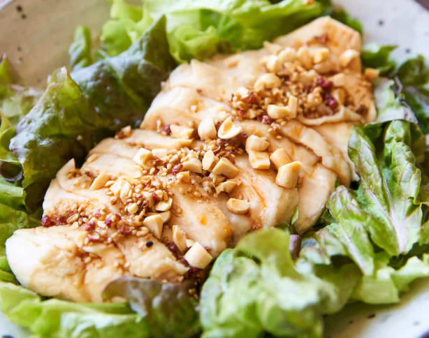 고단백 저지방의 닭 가슴살을 전자레인지로 요리한 닭입니다. 누구에는 간의 기능을 높이거나 보호하는 작용이 있으며 깨를 사용. 토핑의 땅콩에는 간을 정상화시키는 비타민 B1이 다량으로 포함되어 있습니다. 참깨나 땅콩류는 양념장 등에 비비면 맛의 조화가 좋아 추천하는 음식입니다.