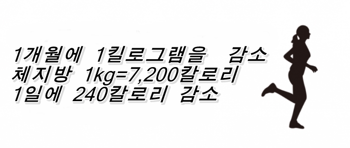 한 달에 체지방을 1㎏ 떨어뜨리면 7,200kcal÷30일=240kcal/일을 식사 혹은 운동에서 줄이면 됩니다.