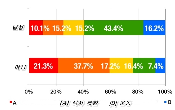 남성은 「운동」이 다수파였고, 반대로 여성은 「식사 제한」이 다수파였습니다.